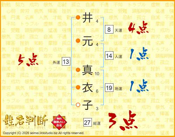 井(4画)元(4画) 真(10画)衣(6画)子(3画)