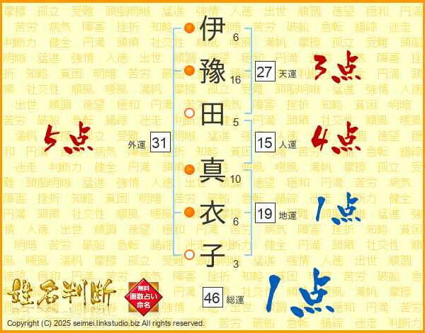 伊(6画)豫(16画)田(5画) 真(10画)衣(6画)子(3画)