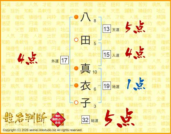 八田真衣子さんの総運は32画の5点!