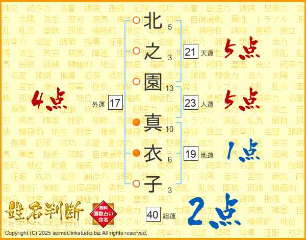 北(5画)之(3画)園(13画) 真(10画)衣(6画)子(3画)