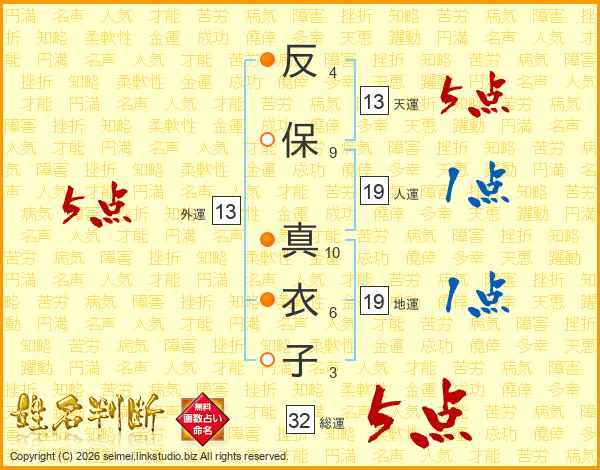 反保真衣子さんの総運は32画の5点!