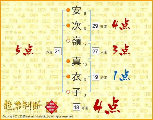 安(6画)次(6画)嶺(17画) 真(10画)衣(6画)子(3画)