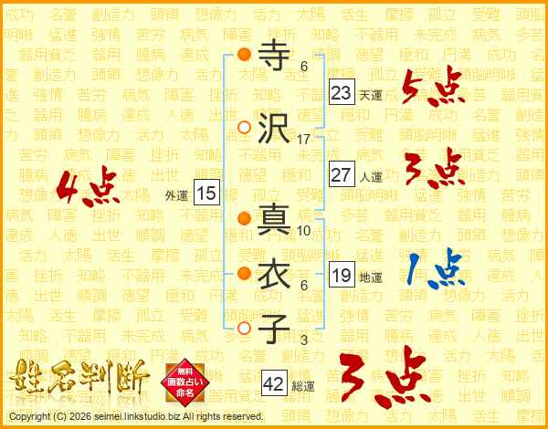 寺(6画)沢(17画) 真(10画)衣(6画)子(3画)