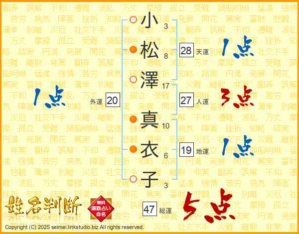 小(3画)松(8画)澤(17画) 真(10画)衣(6画)子(3画)