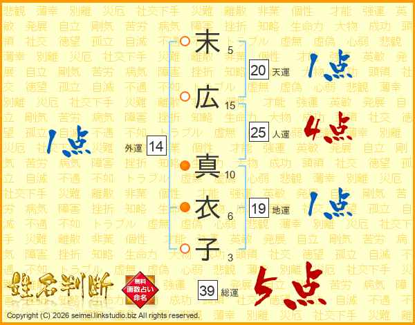 末広真衣子さんの総運は39画の5点!