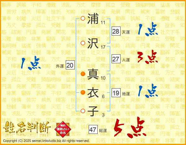 浦(11画)沢(17画) 真(10画)衣(6画)子(3画)