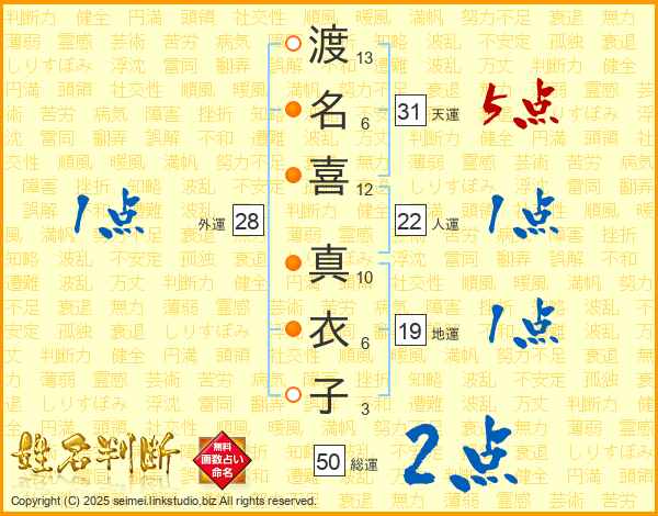 渡(13画)名(6画)喜(12画) 真(10画)衣(6画)子(3画)