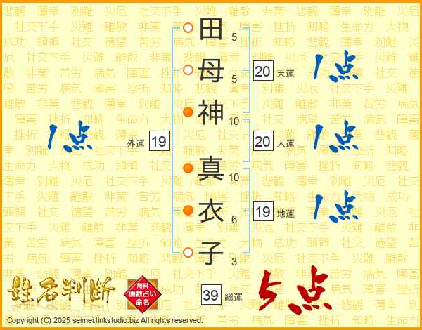 田(5画)母(5画)神(10画) 真(10画)衣(6画)子(3画)
