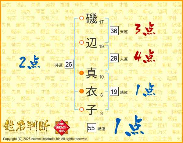 磯(17画)辺(19画) 真(10画)衣(6画)子(3画)