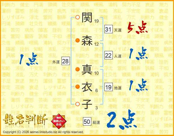関(19画)森(12画) 真(10画)衣(6画)子(3画)