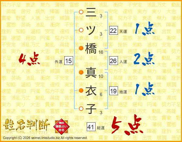 三(3画)ツ(3画)橋(16画) 真(10画)衣(6画)子(3画)