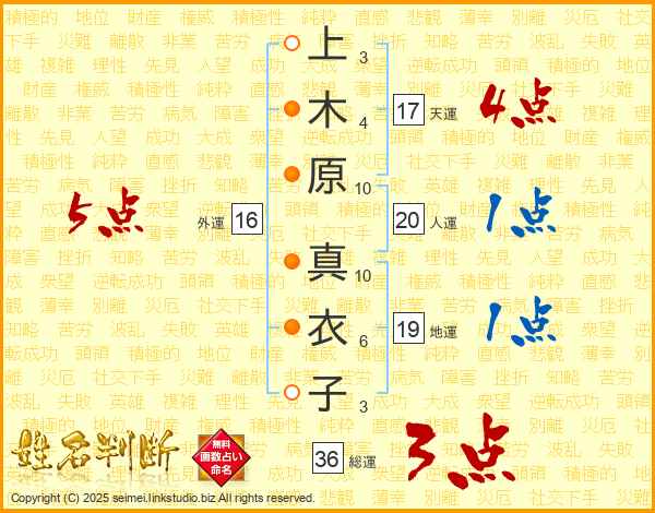生活面を象徴する運勢です。外部から受ける影響力を表し、結婚運、家庭運や職場、環境への順応性を表します。総運から人運を引いた画数。姓や名が1文字の場合を除く。