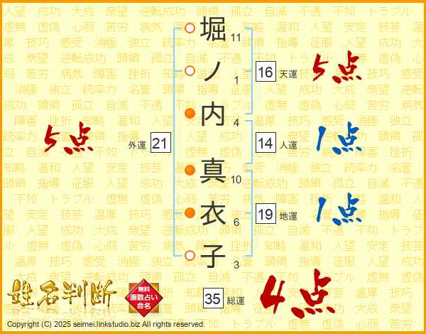 堀(11画)ノ(1画)内(4画) 真(10画)衣(6画)子(3画)