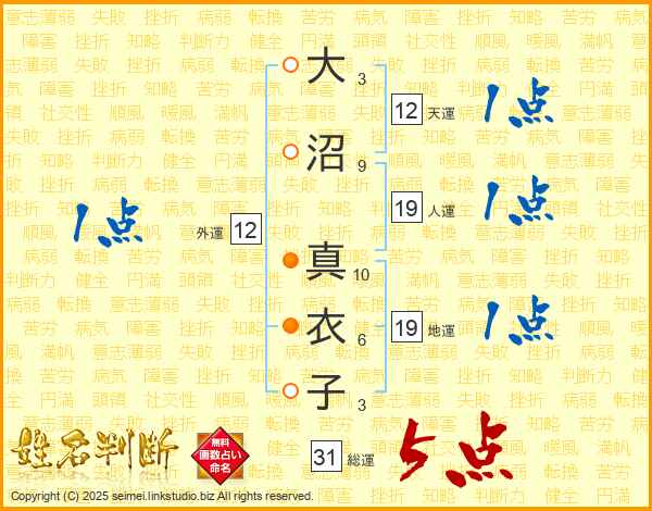大(3画)沼(9画) 真(10画)衣(6画)子(3画)
