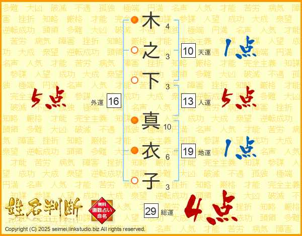 木(4画)之(3画)下(3画) 真(10画)衣(6画)子(3画)