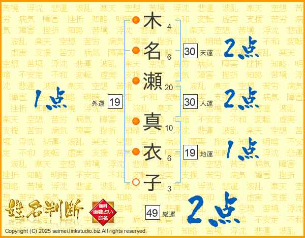 木(4画)名(6画)瀬(20画) 真(10画)衣(6画)子(3画)
