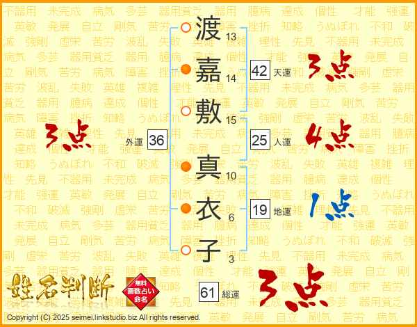 渡(13画)嘉(14画)敷(15画) 真(10画)衣(6画)子(3画)