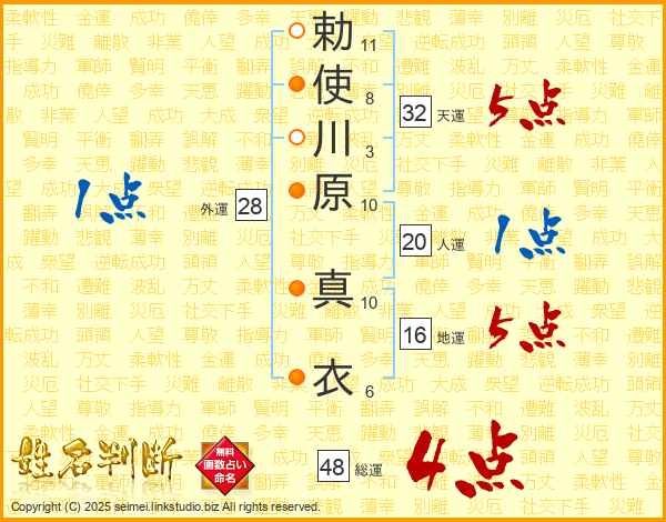 勅(11画)使(8画)川(3画)原(10画) 真(10画)衣(6画)