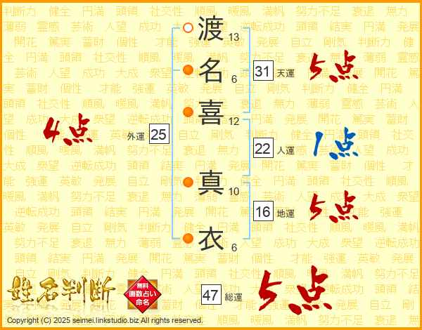 渡(13画)名(6画)喜(12画) 真(10画)衣(6画)