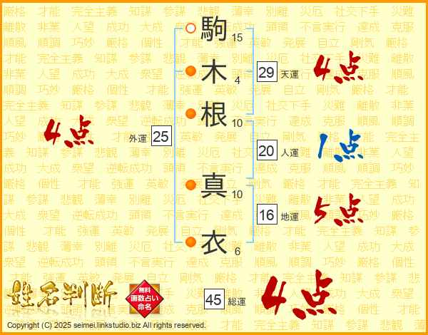 駒(15画)木(4画)根(10画) 真(10画)衣(6画)