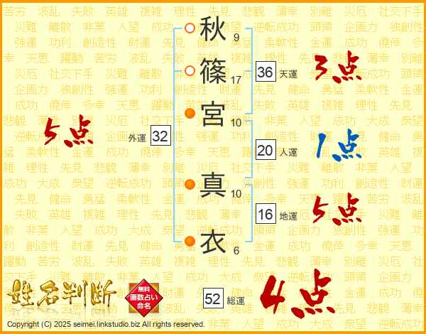 秋(9画)篠(17画)宮(10画)  真(10画)衣(6画)