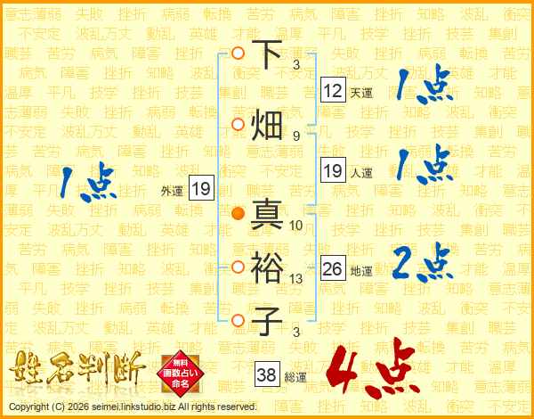 下(3画)畑(9画) 真(10画)裕(13画)子(3画)