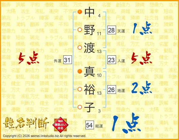 中(4画)野(11画)渡(13画) 真(10画)裕(13画)子(3画)