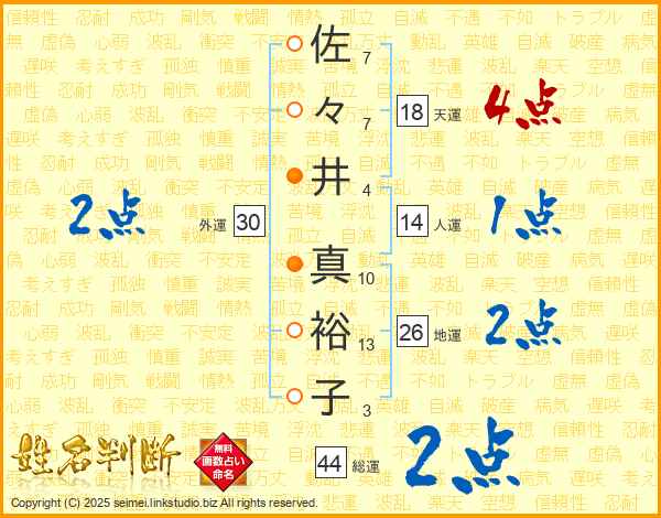 佐(7画)々(7画)井(4画) 真(10画)裕(13画)子(3画)
