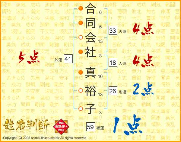 合(6画)同(6画)会(13画)社(8画) 真(10画)裕(13画)子(3画)