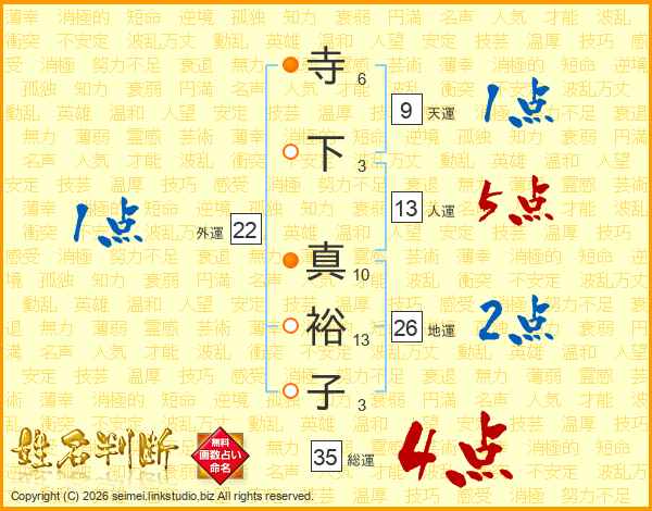 寺(6画)下(3画) 真(10画)裕(13画)子(3画)