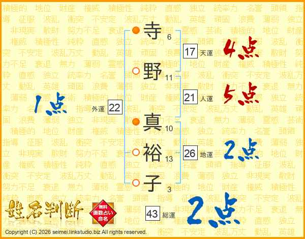 寺野真裕子さんの総運は43画の2点!
