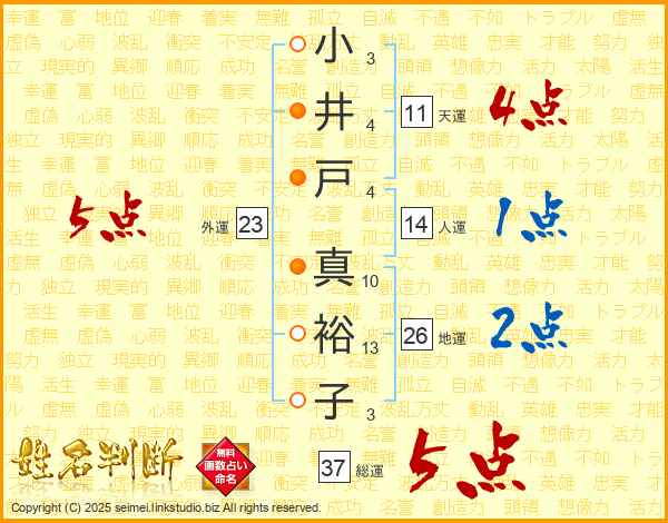 小(3画)井(4画)戸(4画) 真(10画)裕(13画)子(3画)
