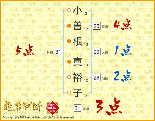 小(3画)曽(12画)根(10画) 真(10画)裕(13画)子(3画)