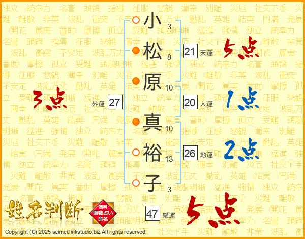 小(3画)松(8画)原(10画) 真(10画)裕(13画)子(3画)