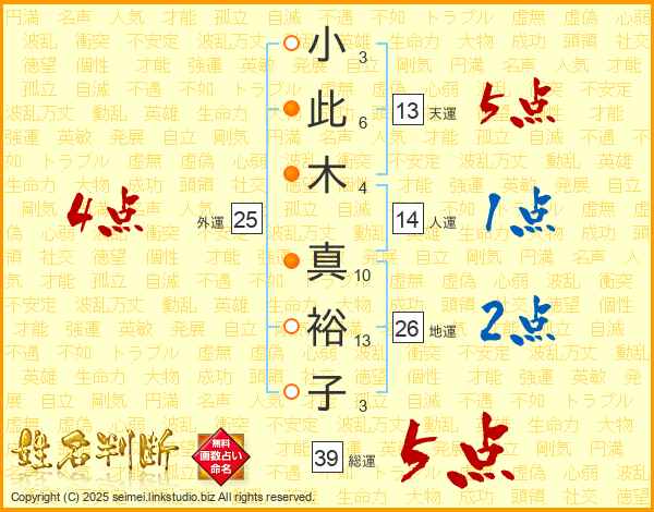 小(3画)此(6画)木(4画) 真(10画)裕(13画)子(3画)