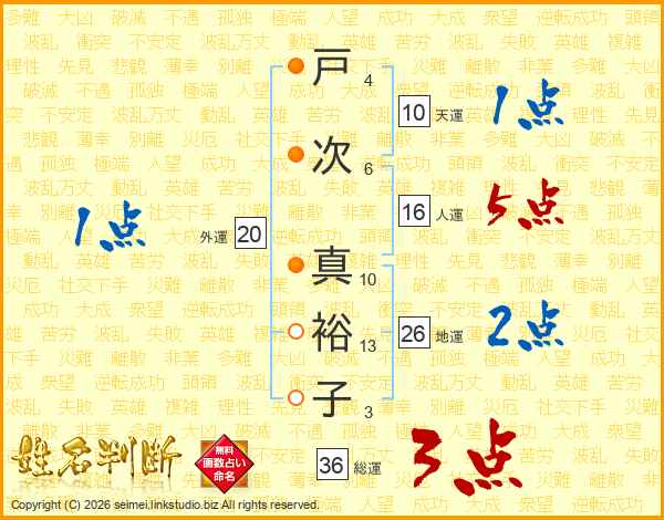 戸(4画)次(6画) 真(10画)裕(13画)子(3画)