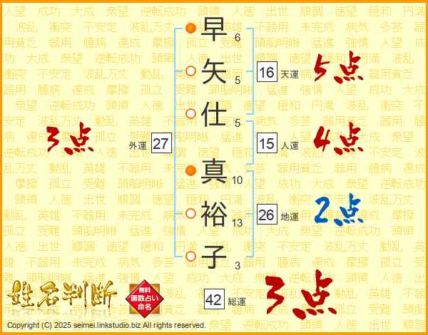 早(6画)矢(5画)仕(5画) 真(10画)裕(13画)子(3画)