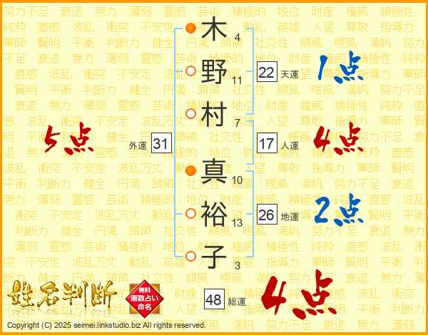 木(4画)野(11画)村(7画) 真(10画)裕(13画)子(3画)