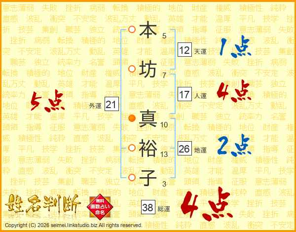 本(5画)坊(7画) 真(10画)裕(13画)子(3画)