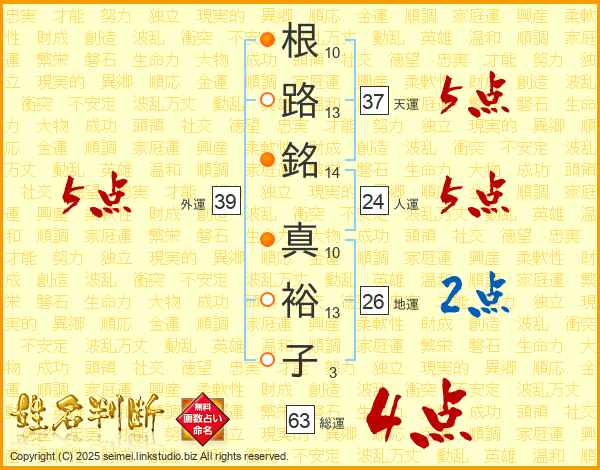 根(10画)路(13画)銘(14画) 真(10画)裕(13画)子(3画)