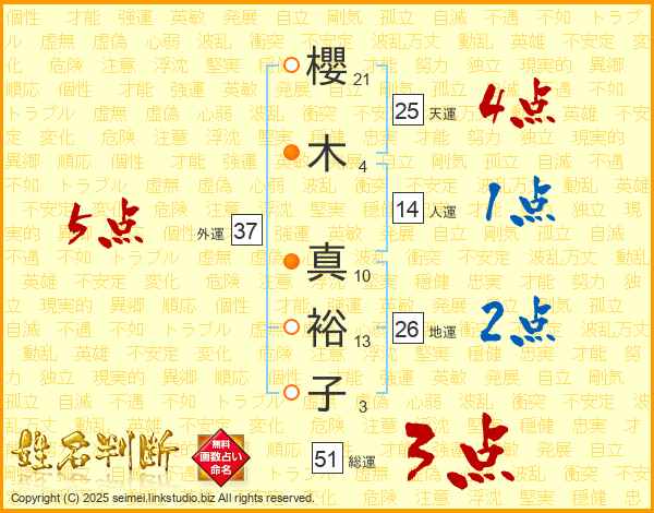 櫻(21画)木(4画) 真(10画)裕(13画)子(3画)