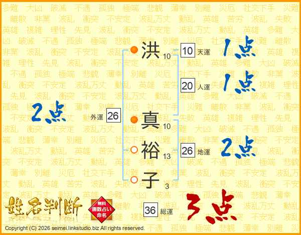 あなたの人生を表す1番重要な運勢です。生涯を通じて影響する総合運となり、主に50歳以降の晩年期に影響を及ぼします。苗字と名前の合計画数。