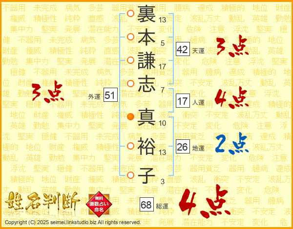 裏(13画)本(5画)謙(17画)志(7画) 真(10画)裕(13画)子(3画)