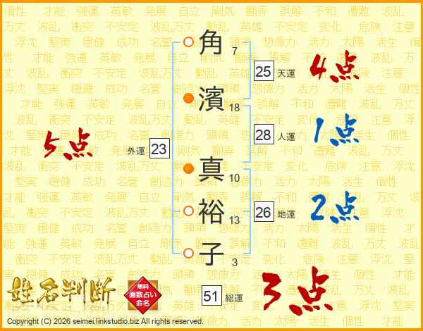 角(7画)濱(18画) 真(10画)裕(13画)子(3画)