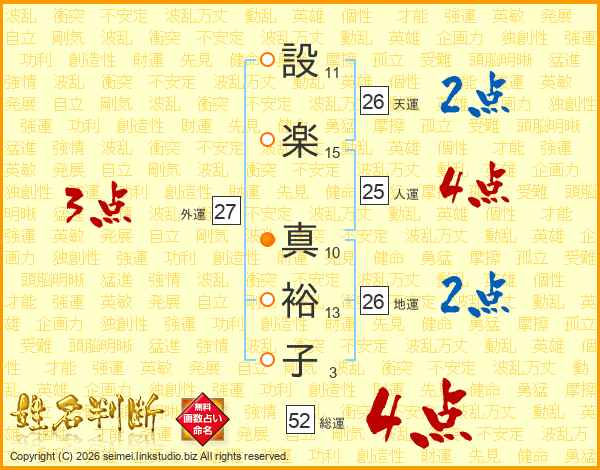 設(11画)楽(15画) 真(10画)裕(13画)子(3画)