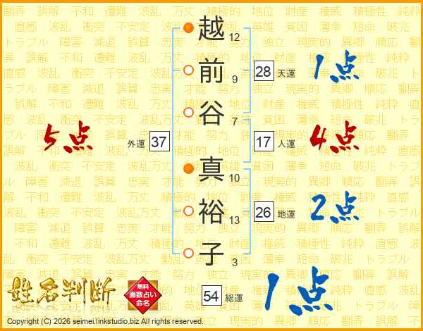 越(12画)前(9画)谷(7画) 真(10画)裕(13画)子(3画)