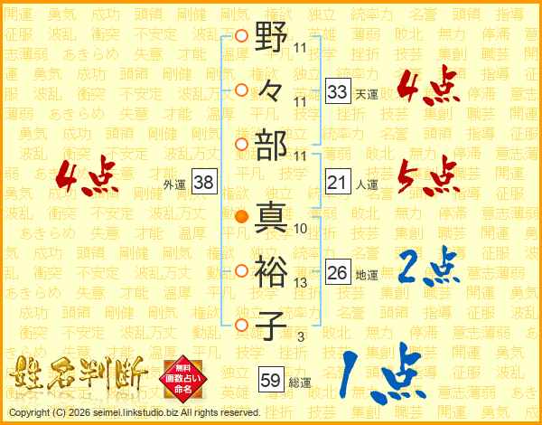 野(11画)々(11画)部(11画) 真(10画)裕(13画)子(3画)