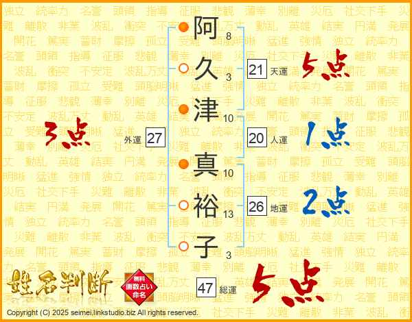 阿(8画)久(3画)津(10画) 真(10画)裕(13画)子(3画)