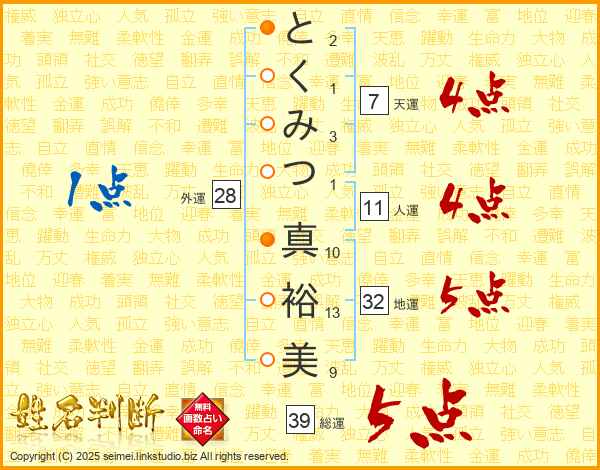 と(2画)く(1画)み(3画)つ(1画) 真(10画)裕(13画)美(9画)