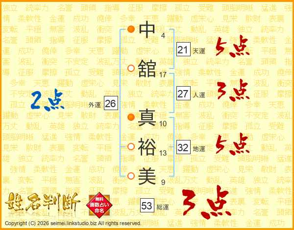 中(4画)舘(17画) 真(10画)裕(13画)美(9画)